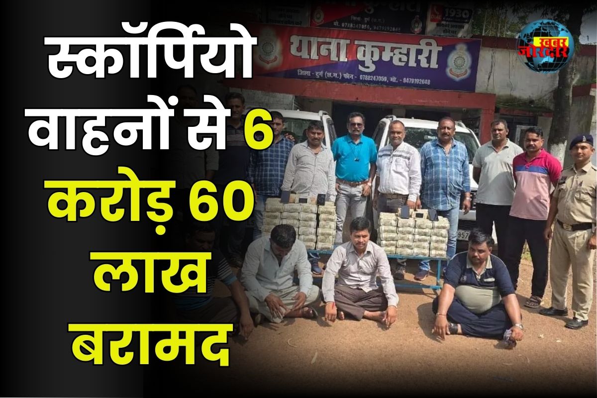 Cash Sizes from Durg: छत्तीसगढ़ के कुम्हारी टोल प्लाजा के पास दुर्ग पुलिस ने शनिवार को महाराष्ट्र में रजिस्टर्ड दो स्कॉर्पियो गाड़ियों से 6 करोड़ 60 लाख रुपये नकद बरामद किए. दरअसल, पुलिस को रात 2-3 बजे सूचना मिली थी कि बड़ी मात्रा में नकदी का हेरफेर होने वाला है. इस सूचना के आधार पर पुलिस ने कुम्हारी टोल प्लाजा पर घेराबंदी की और सभी वाहनों की तलाशी शुरू की.