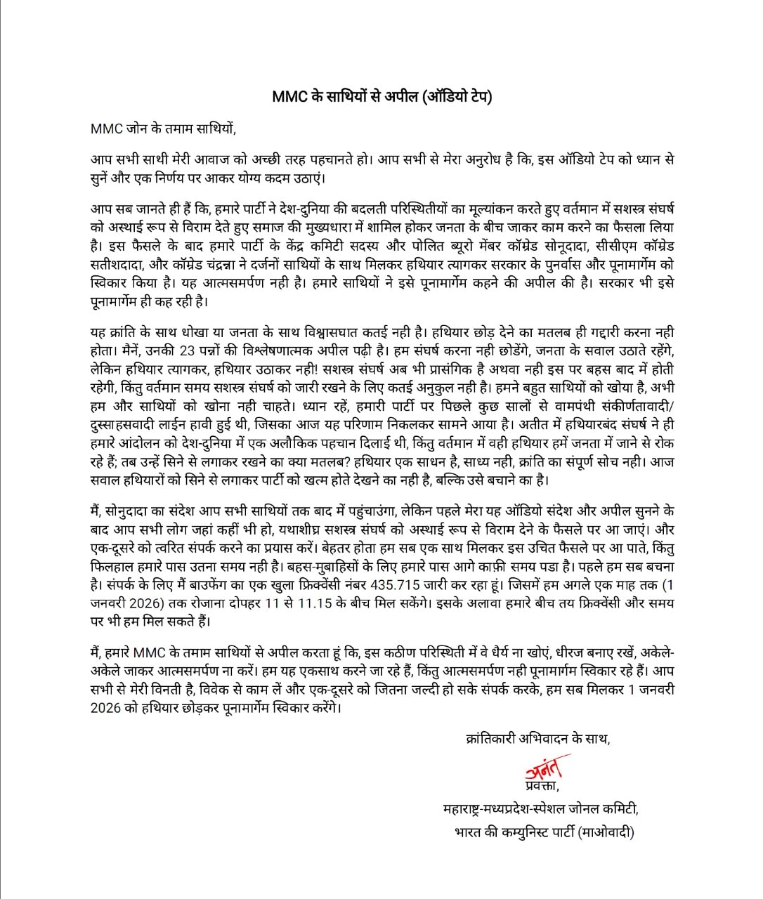 Chhattisgarh News: नक्सली प्रवक्ता ने साफ कहा कि हथियार छोड़ना जनता के साथ गद्दारी नहीं है. उनके शब्दों में, “हथियार सिर्फ एक साधन है, साध्य नहीं. अभी का समय हथियारबंद संघर्ष का नहीं है. जनता की भलाई के लिए हम यह कदम उठा रहे हैं.” सभी साथियों के बीच आपसी संपर्क और तालमेल बनाए रखने के लिए अनंत ने एक खुला रेडियो फ्रीक्वेंसी नंबर भी जारी किया है, जिसे बाउपेंग कहा जा रहा है. इस नंबर पर कोई भी नक्सली संपर्क कर सकता है.